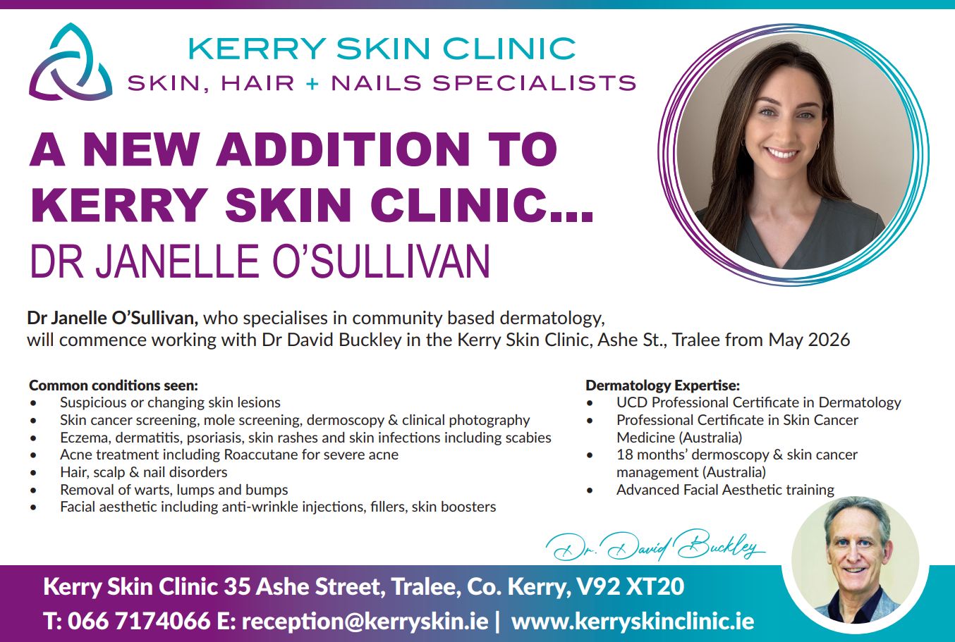 Dr Janelle O’Sullivan is pleased to announce that she will be joining Dr David Buckley and the team at the Kerry Skin Clinic, Ashe Street, Tralee, from May 2026.